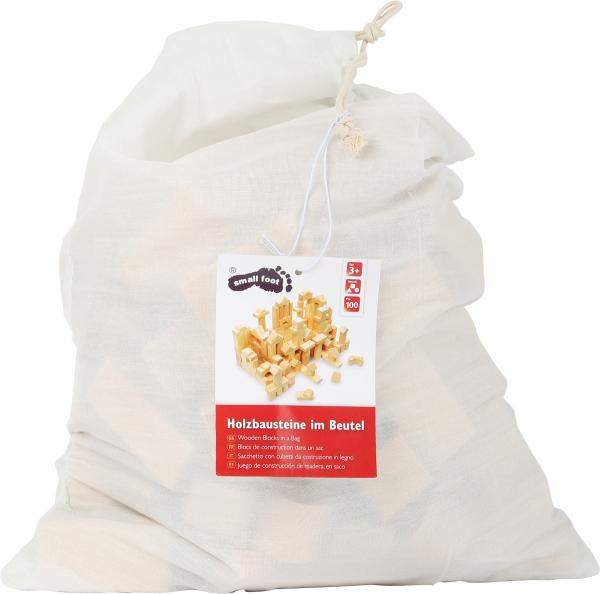 Komplexná sada 100 prírodných drevených kociek rôznych tvarov pre vytváranie najrôznejších stavieb. Kocky sú uložené v plátennom vrecúšku pre jednoduchšie prenášanie.